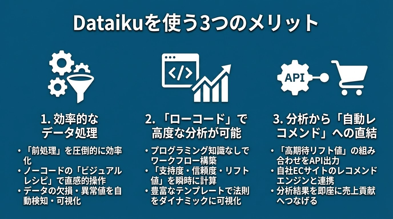 SKU(商品数)が数万件を超えるECサイトでは、組み合わせのパターンは億単位に膨れ上がります。Dataikuを使えば、この複雑なプロセスをシンプルかつ強力に自動化できます。