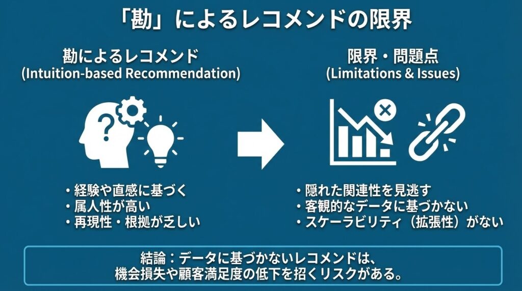 多くのECサイトでは、いまだに「担当者の経験」や「売れ筋ランキング」に基づいたレコメンドが行われています。しかし、これら「勘」に頼った施策には限界があります。