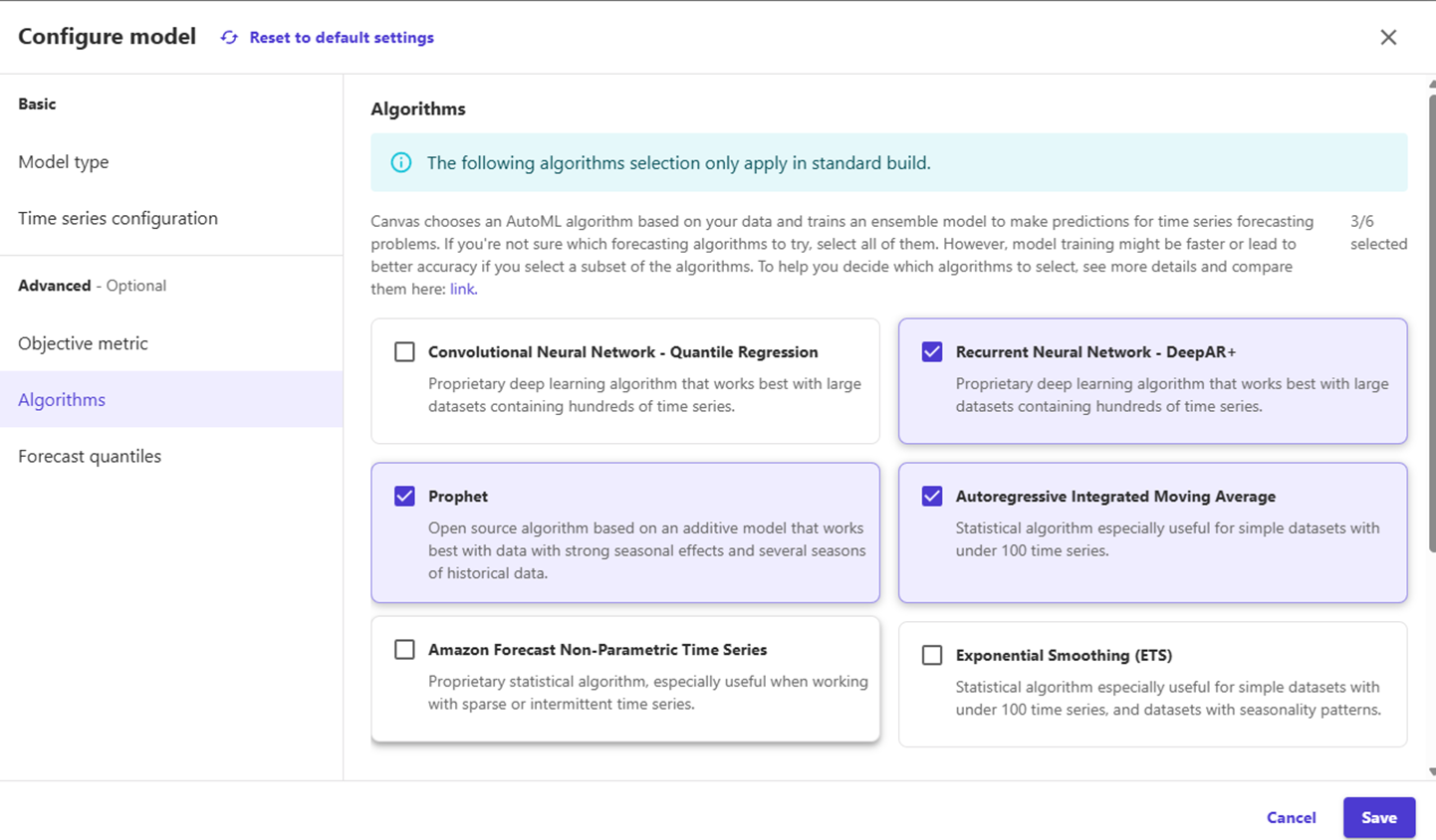 また、「Algorithms」から今回使用するモデルは、DeepAR+, Prophet, Autoregressive Integrated Moving Average(ARIMA)の3つを選択しました。