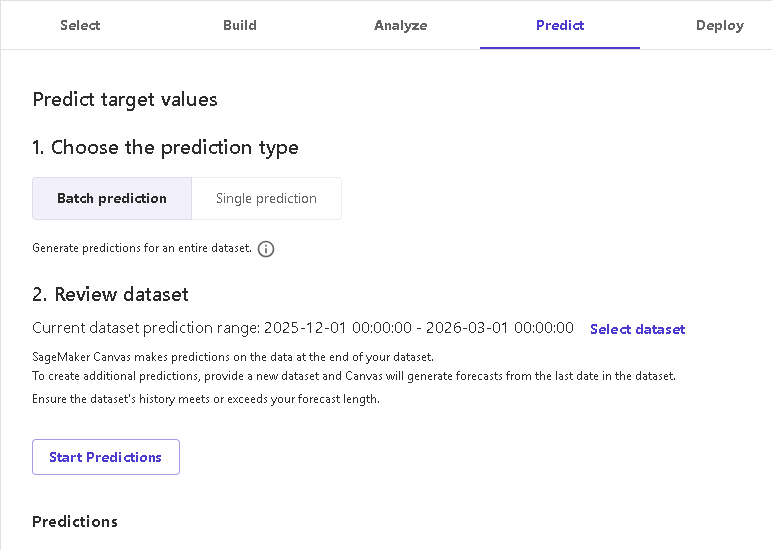 画面上部の「Predict」をクリックすると実際データには存在しない3か月分(2026/1/1~2026/3/1)の予測値を算出することができます。