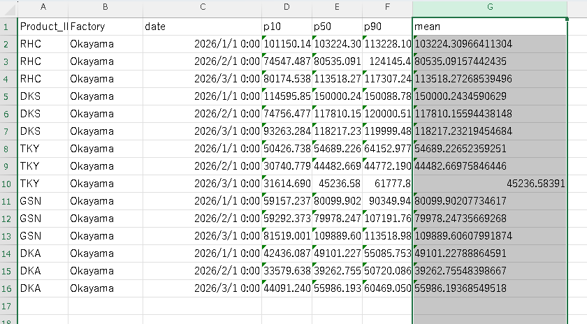 出力結果は岡山工場の製品に絞ったものですが、各製品2026/1/1~2026/3/1の予測値が出力されます。