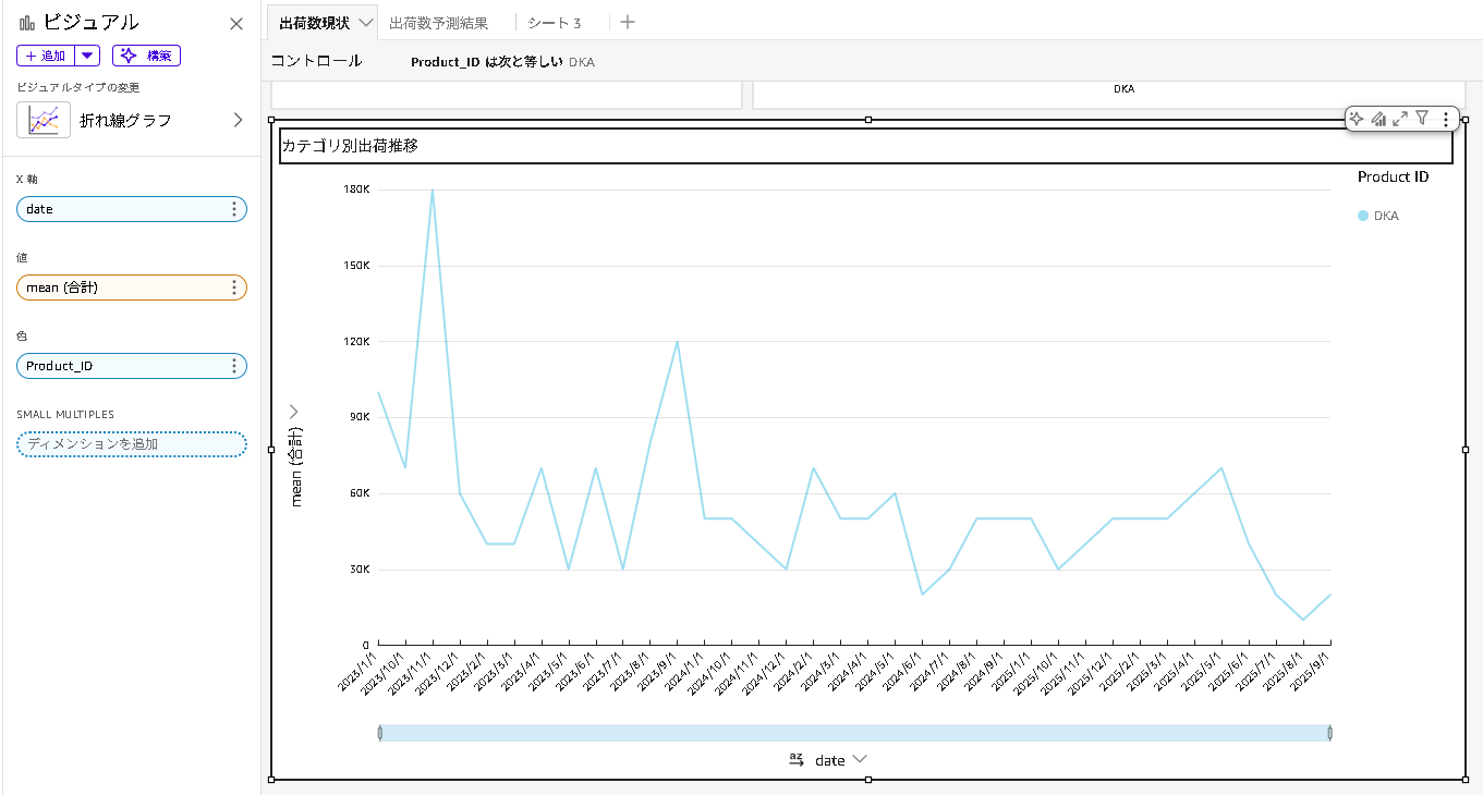 また、AWSにはQuickSightというデータの可視化サービスも備わっており、Sagemaker Canvasでで出力した予測値のデータもグラフにすることができます。今回は簡易ではありますが、ダッシュボードを構築してみました。