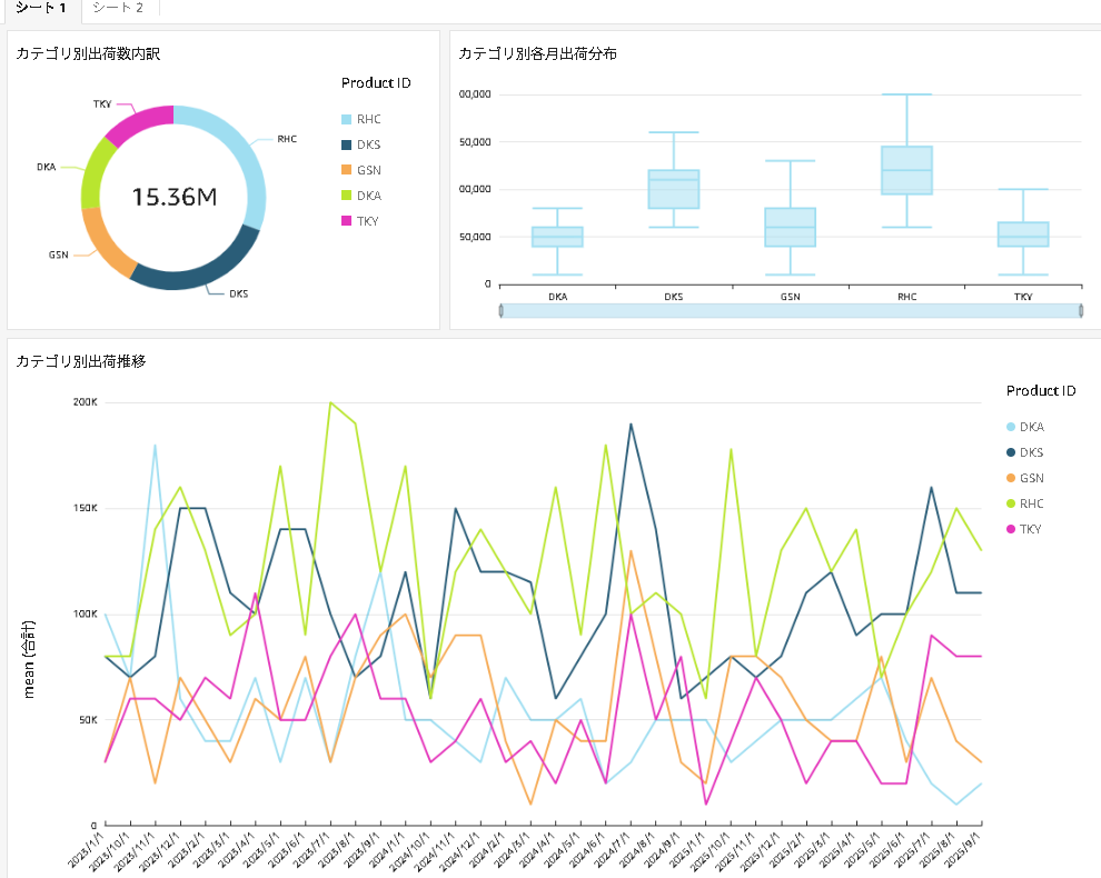 1枚目が予測する上で、現状のカテゴリごとの出荷数を様々な角度から分析したダッシュボードです。