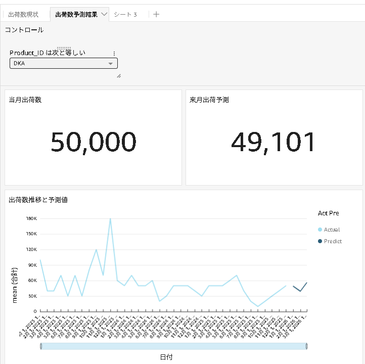 2枚目のダッシュボードが特定の商品について、来月の出荷数など今後の情報を把握するためのダッシュボードです。