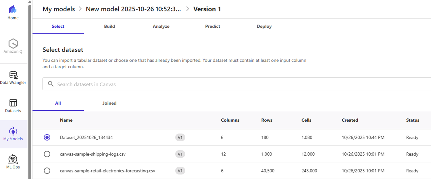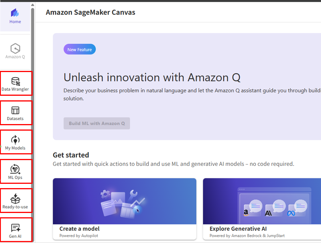 実際にAmazon Sagemaker Canvasを開いてみると以下の画面に遷移します。