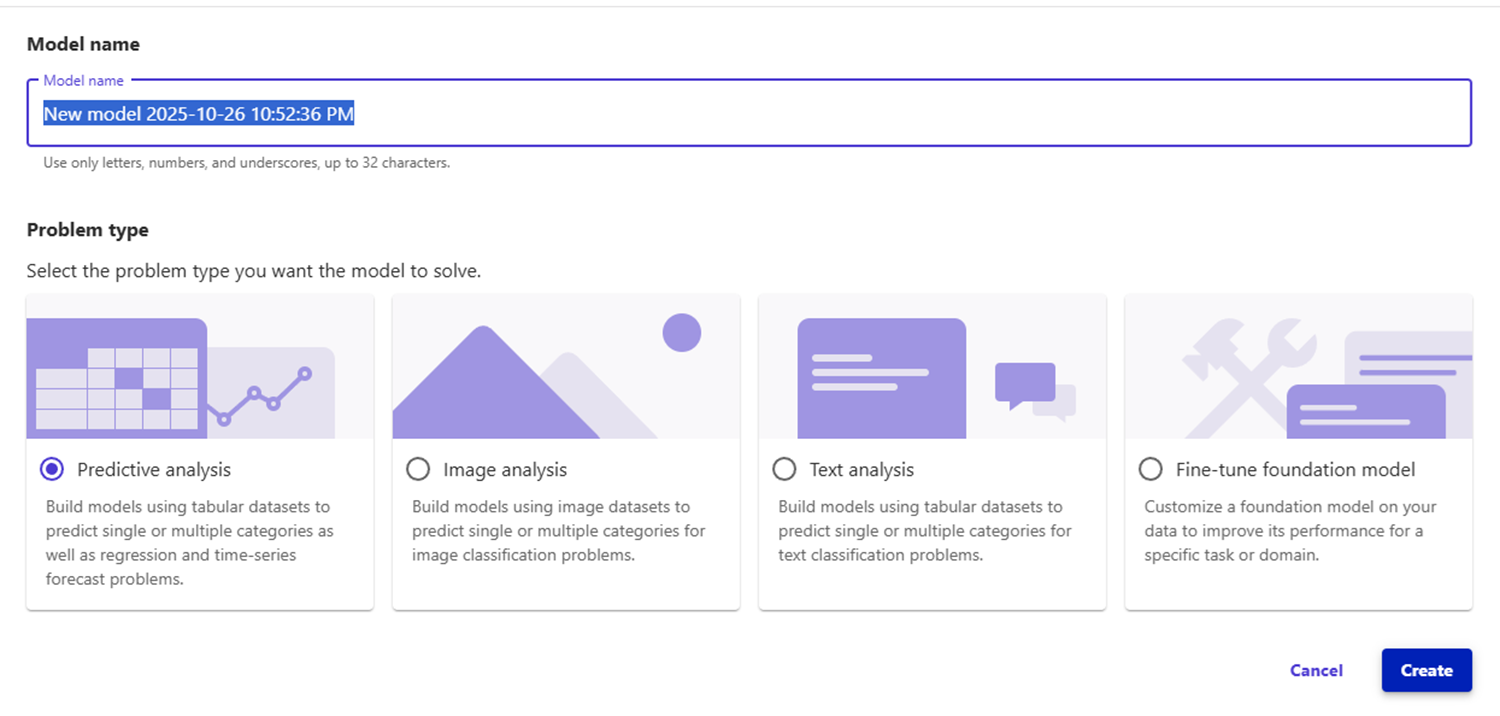 モデルを構築していきます。今回は3か月先までの出荷量を予測したいので、Problem typeに「Predictive analysis」を選択します。