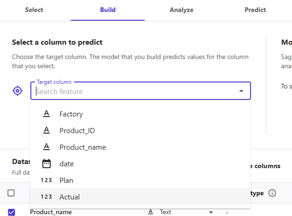 次に予測する対象を選択します。今回は出荷量の実績値(Actual)を予測したいので、「Actual」をTarget Columnに指定します。