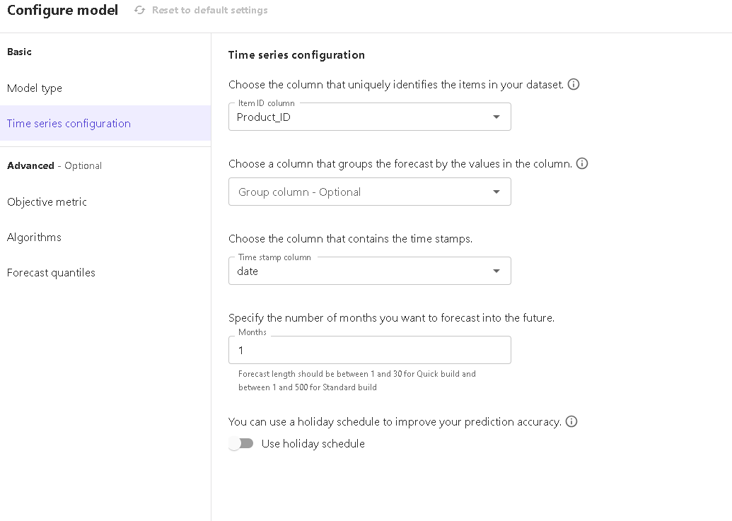 まず、「Time series configuration」からデータのユニークなIDについては、Product_IDを指定しました。(商品ごとの出荷量を予測したいため)