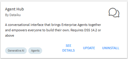 Agent Hubはプラグインとして用意されています。プラグインストアから環境にインストールすることが可能です。(ただし、Agent HubをインストールするにはDataiku ver 14.2.0にアップデートする必要があります)