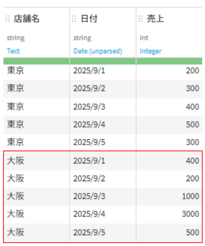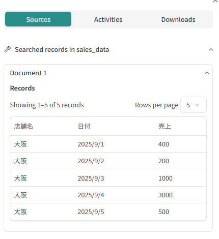 各店舗の日別の売上データを検索するエージェントに大阪店の売上を聞いた際の回答は以下のようになります。