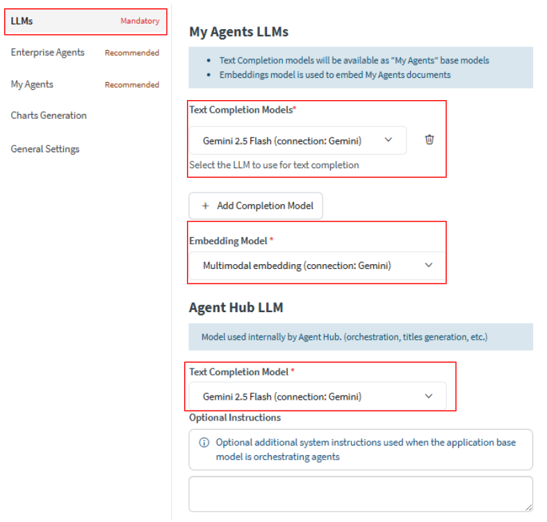 LLMsは必須の設定となっており、上からMy Agents LLMsのText Completion Models,Embedding ModelとAgent Hub LLMを設定する必要があります。