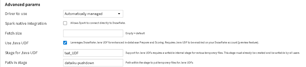 コネクション設定時に、[Use Java UDF]にチェックを入れます。チェックを入れると、[Stage for Java UDF]と[Path in stage]の項目がでてくるので、[Stage for Java UDF]には先ほど作成したステージ名、[Path in stage]には任意の名前を入力します。([Path in stage]についてはステージ内のサブパスのようなもので、事前に準備しておく必要がない)