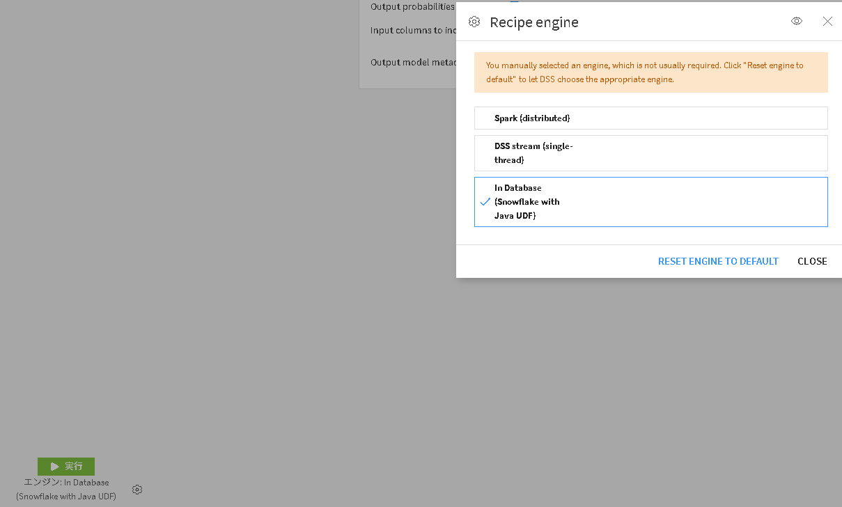 スコアリングレシピに遷移し、実行エンジンを確認すると他のレシピにはない[In Database (Snowflake with Java UDF)]というエンジンを選択することができます。こちらを選ぶと構築したモデルがSnowflake内のUDFとして予測値算出してくれるようになります。