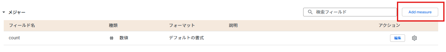 メジャーの設定を追加したいので、右下のAdd measureをクリックします。