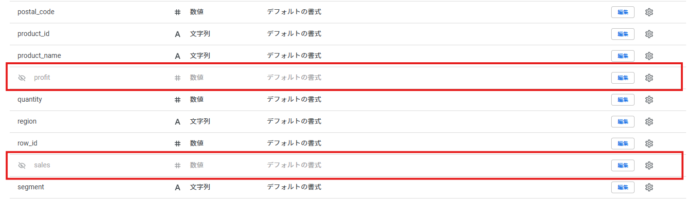 メジャーは作成できましたが、ディメンションにもProfitやSalesの数値型フィールドが残っています。こちらは非表示設定にすることで重複を避けます。非表示は歯車マークから設定できます。