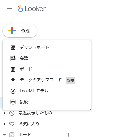 Lookerホーム画面から作成をクリックします。データのアップロード(新規)という項目が追加されていますので、そちらをクリックします。