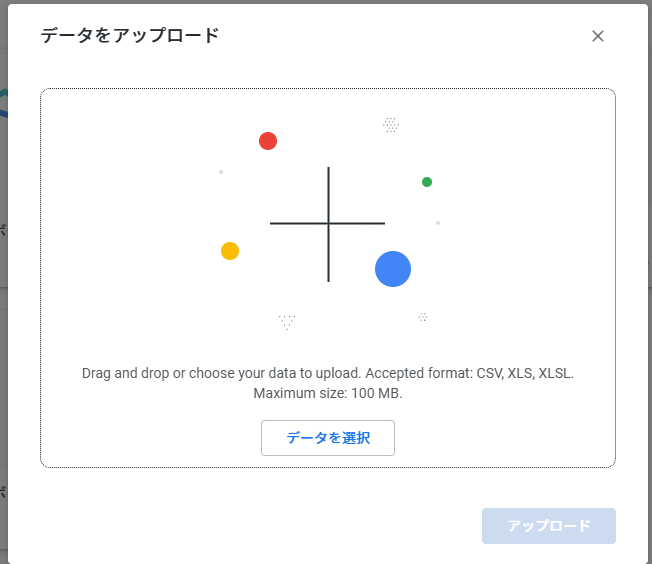 データをアップロードのウィンドウが出てきますので、CSVやExcelファイルをアップロードします。アップロードするデータのサイズには制限があり、100MBまでとなっています。