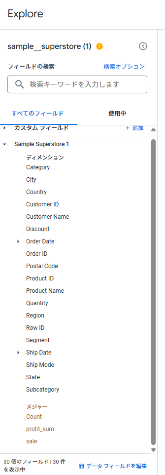 すぐにExploreの画面に移行したいですが、よくみると売上や利益といったメジャーがディメンションとして認識されてしまっているようです。可視化する前にデータ型を変更してあげる必要があります。