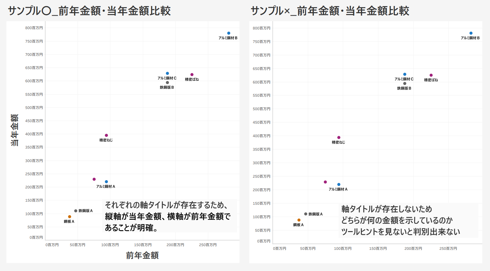 軸タイトルはデータが何を示すのかを判別する要素です。そのため基本的には出しておいた方が良いです。しかし、シートタイトルやダッシュボードタイトルなどで明記されており、軸タイトルを出さなくても明確であるケースもあります。その場合は軸タイトルを省くことで、グラフの描画領域が多く取ることが出来ます。軸タイトルを表示すべきか、しないべきか考えましょう。