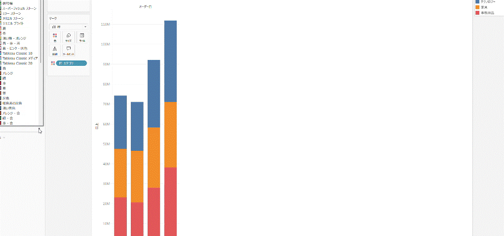 | カテゴリ別のパレット | ディメンション(不連続):個々の項目を区別する値 | 顧客区分、製品名、地域など |