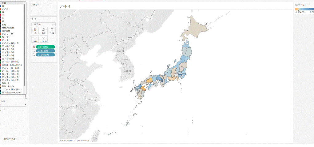 「利益」のような連続値を色分けする際、ビューの粒度やフィルタリングによって、マイナス値がない場合は連続パレットが使われ、マイナス値が存在すると分化のパレットに自動で切り替わります。