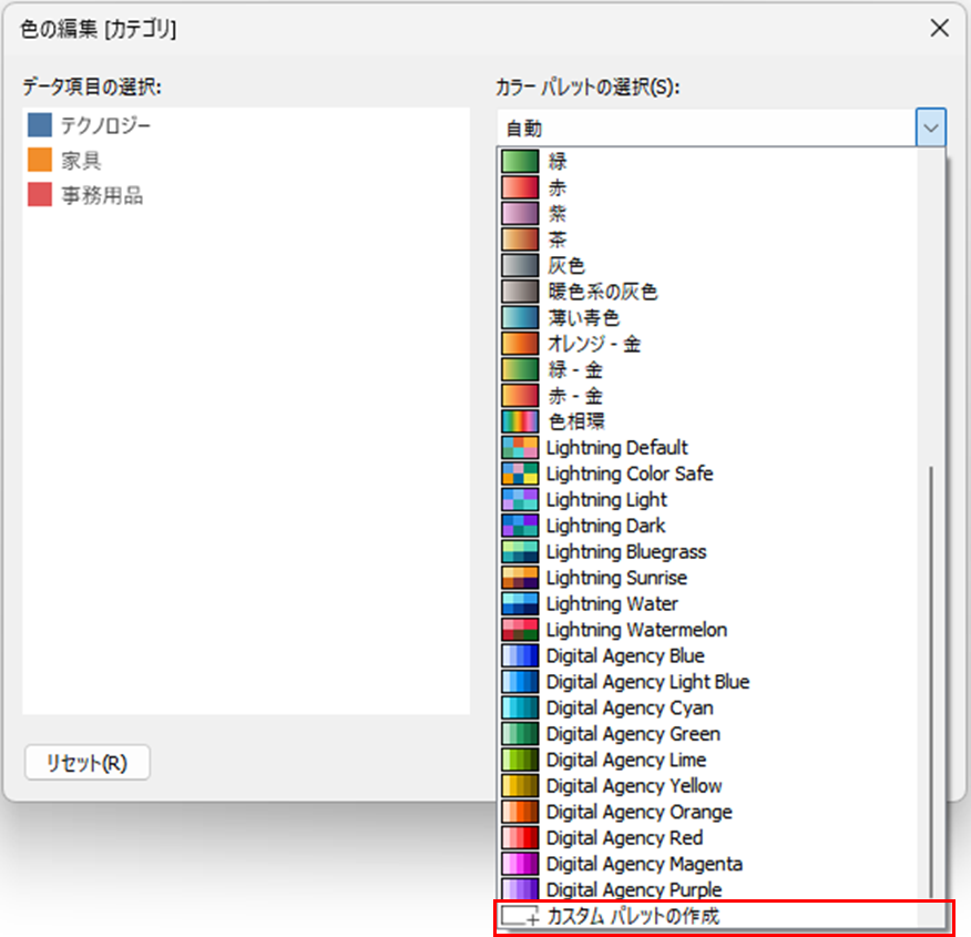 Step1:色の編集を開き、カラーパレットの選択からカスタムパレットの作成を選択します。
