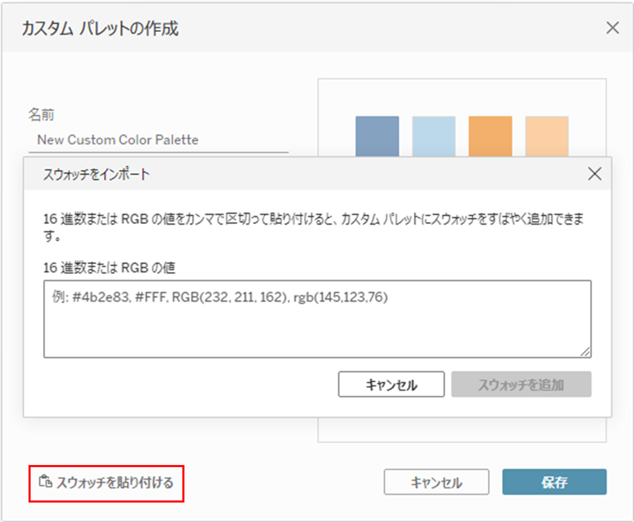 また、スウォッチを貼り付けるをクリックと、16進数またはRGBの値からパレットに色を追加することができます。