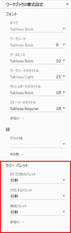 Step1:ツールバーの書式設定からワークブックをクリックすると、ワークブックの書式設定欄にカラーパレットの欄が新たに追加されています。