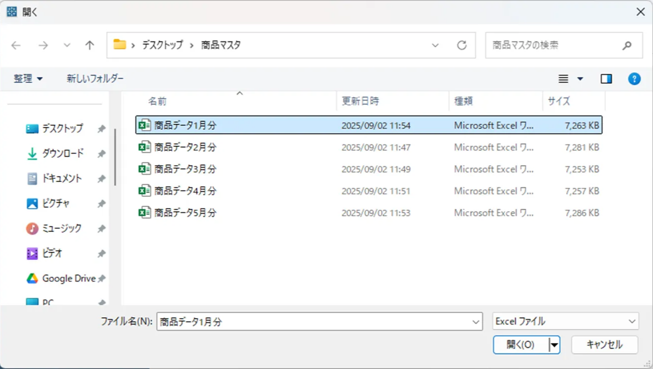 ダイアログが開かれるので、統合したいExcelファイルの1つを選択します。