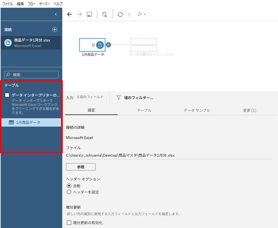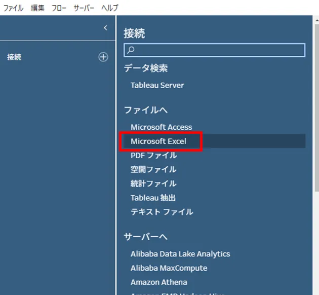 1.ファイルへの接続:Tableau Prepを開き、「接続」ペインから統合したいExcelファイルの1つを選択します。