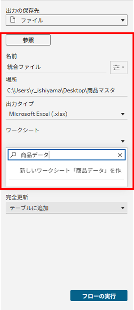 6.データ出力の実行:参照よりファイル形式や保存先などの出力先の情報を選択し、フローの実行をします。(新規にExcelファイルを作成するなど、出力先にワークシートがない場合は新しいワークシートを作成してください)