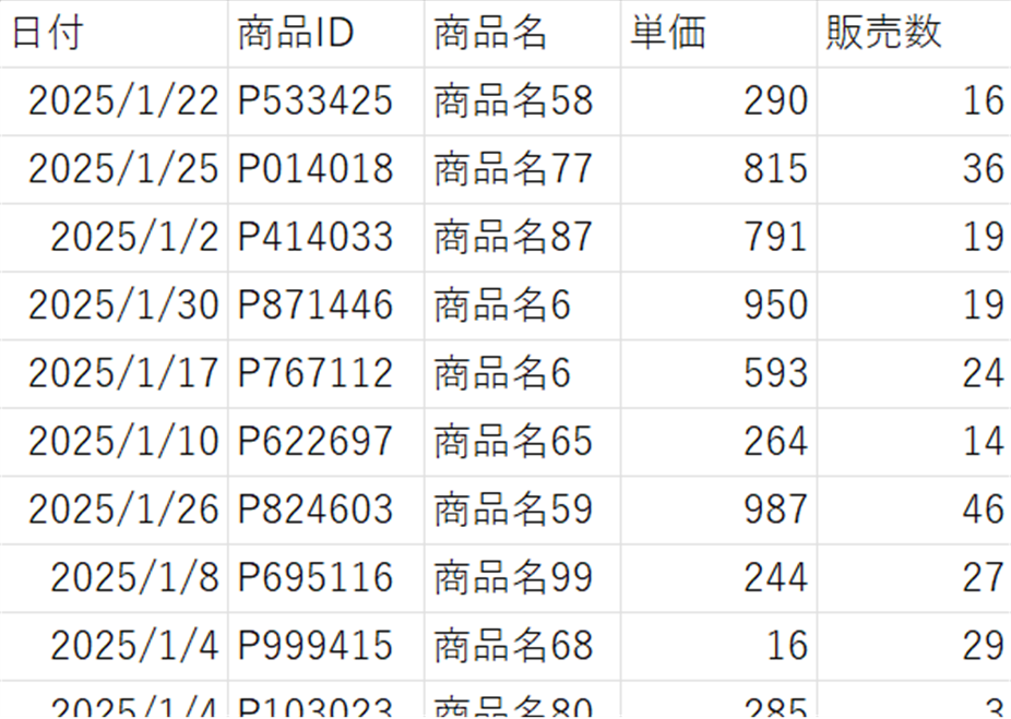 今回は、統合後のデータがExcelの行数限界に迫る約100万行となるケースを想定しました。使用したデータは、以下の5つの項目で構成された、1月から5月までの5つのExcelファイルです。各ファイルには、それぞれ約20万行のダミーデータが含まれています。