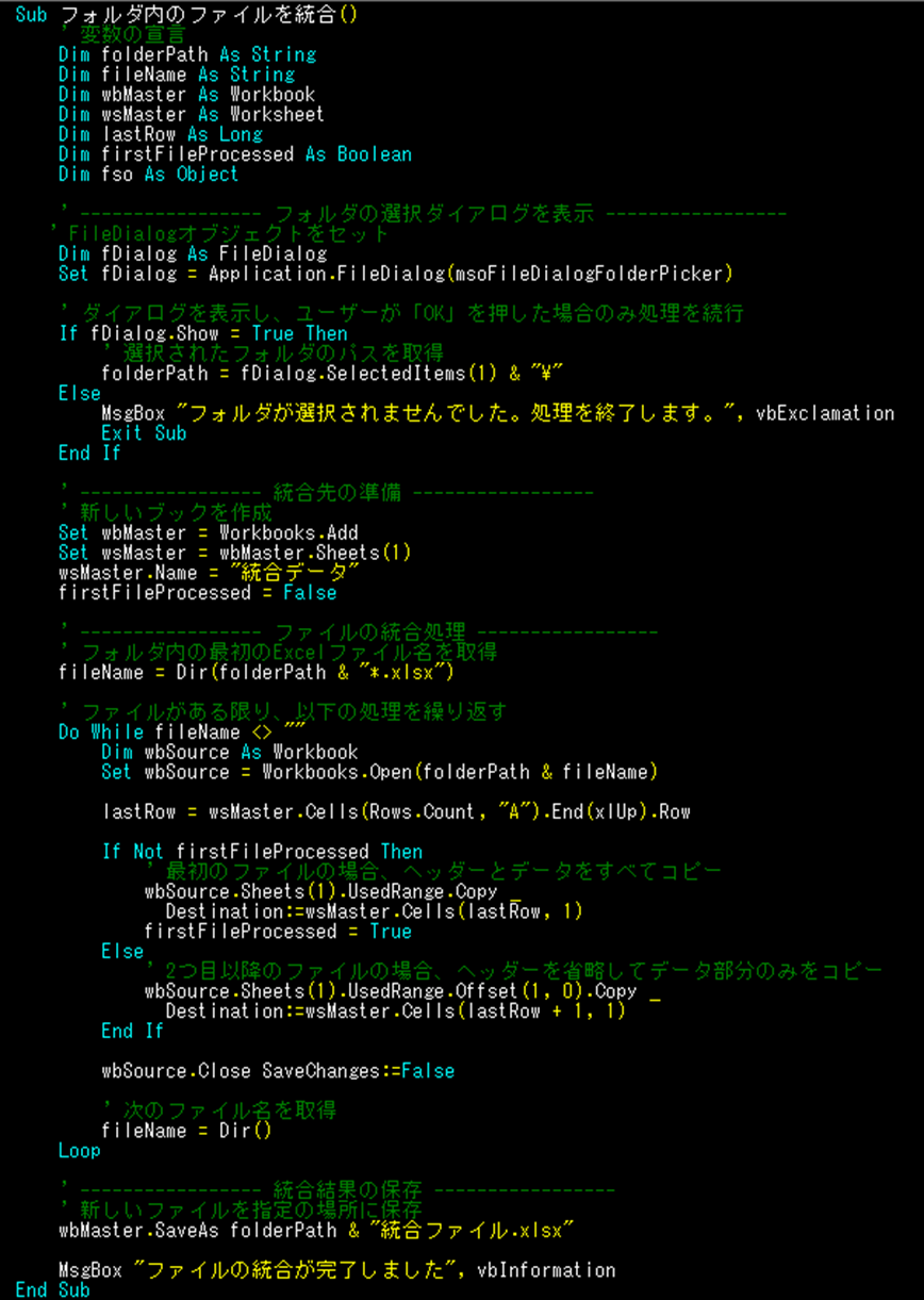 VBAで処理を行う場合、例えば以下のようなコードを記述します。フォルダの指定、ファイルのループ処理、各ファイルのデータのコピー&ペースト、そして新しいシートへの貼り付けといった一連の動作を、すべてコードで正確に指示しなければなりません。このコードは初心者にとっては難易度が高く、処理内容を理解するのも一苦労です。