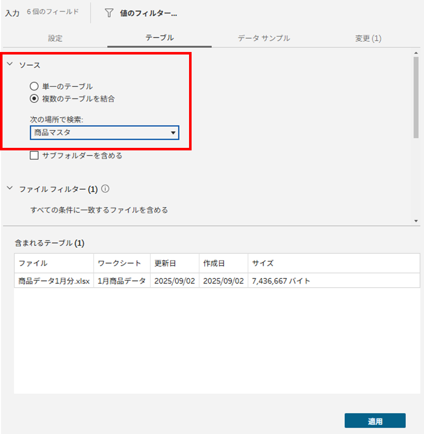 2.フォルダ選択:テーブルタブのソース部分にて、「複数のテーブルを結合」を選択し、統合したいファイルが格納されているフォルダを指定します(初めに選択したファイルが格納されているフォルダが選択済)。