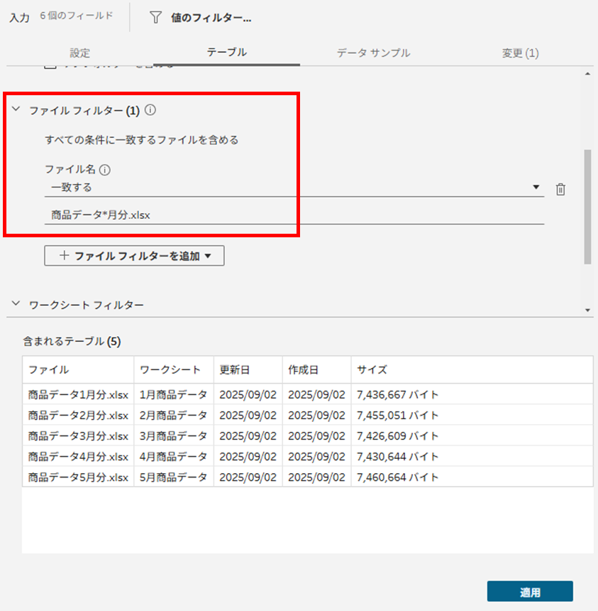 3.ワイルドカードユニオン:テーブルタブのファイルフィルター部分にて、統合したいファイル名を*を用いて指定します。Prepが自動でフォルダ内のファイルを認識し、ワイルドカードユニオンとして統合します。
