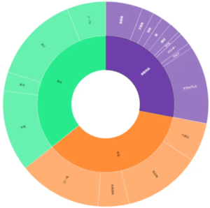ちなみに下記のように円グラフの中心がくりぬかれているのがドーナツグラフで その周りにさらに階層が増えて詳細な情報が確認できるのがサンバーストチャートです。