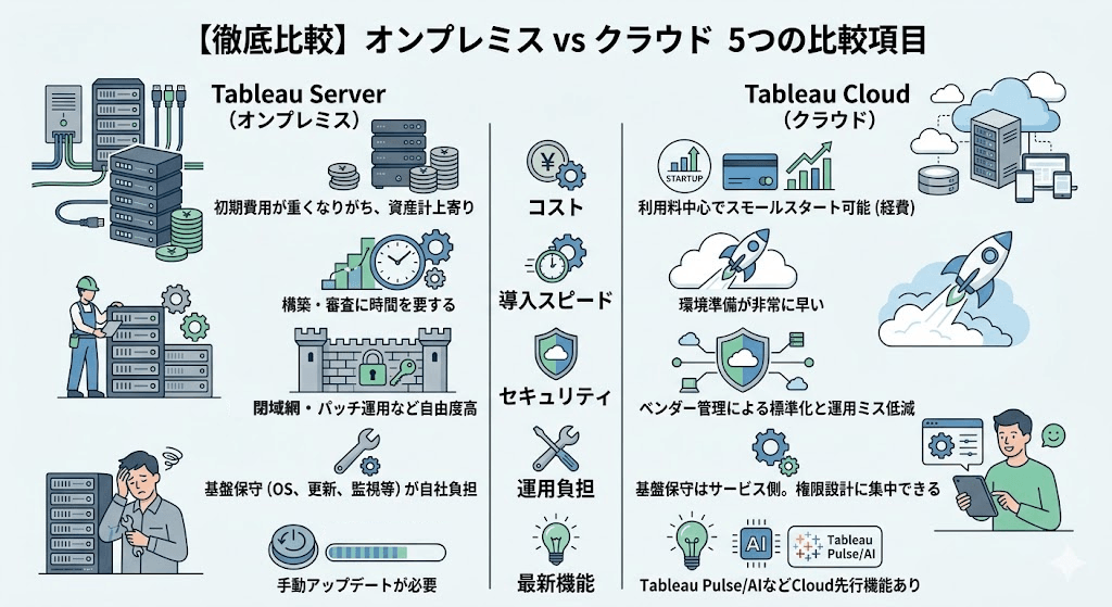 - Tableau Cloud は、導入スピード・運用負荷・Cloud先行機能(Pulse/AI)に強い