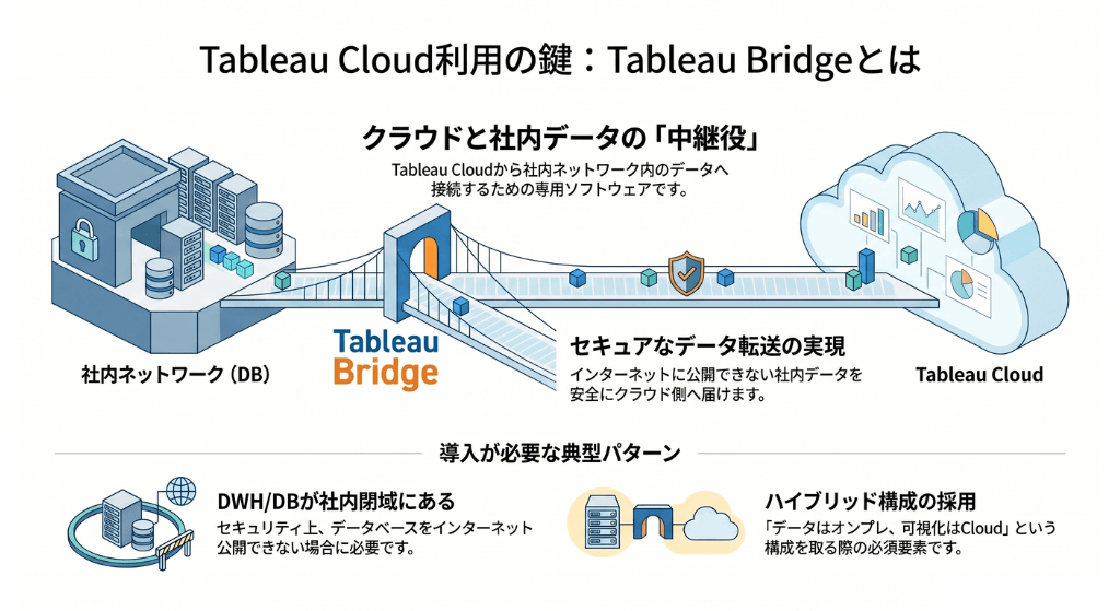 Tableau CloudはSaaSなので、Cloud側から直接到達できない 社内ネットワーク(プライベートネットワーク)上のデータに対しては追加設計が必要です。そこで登場するのが Tableau Bridge です。