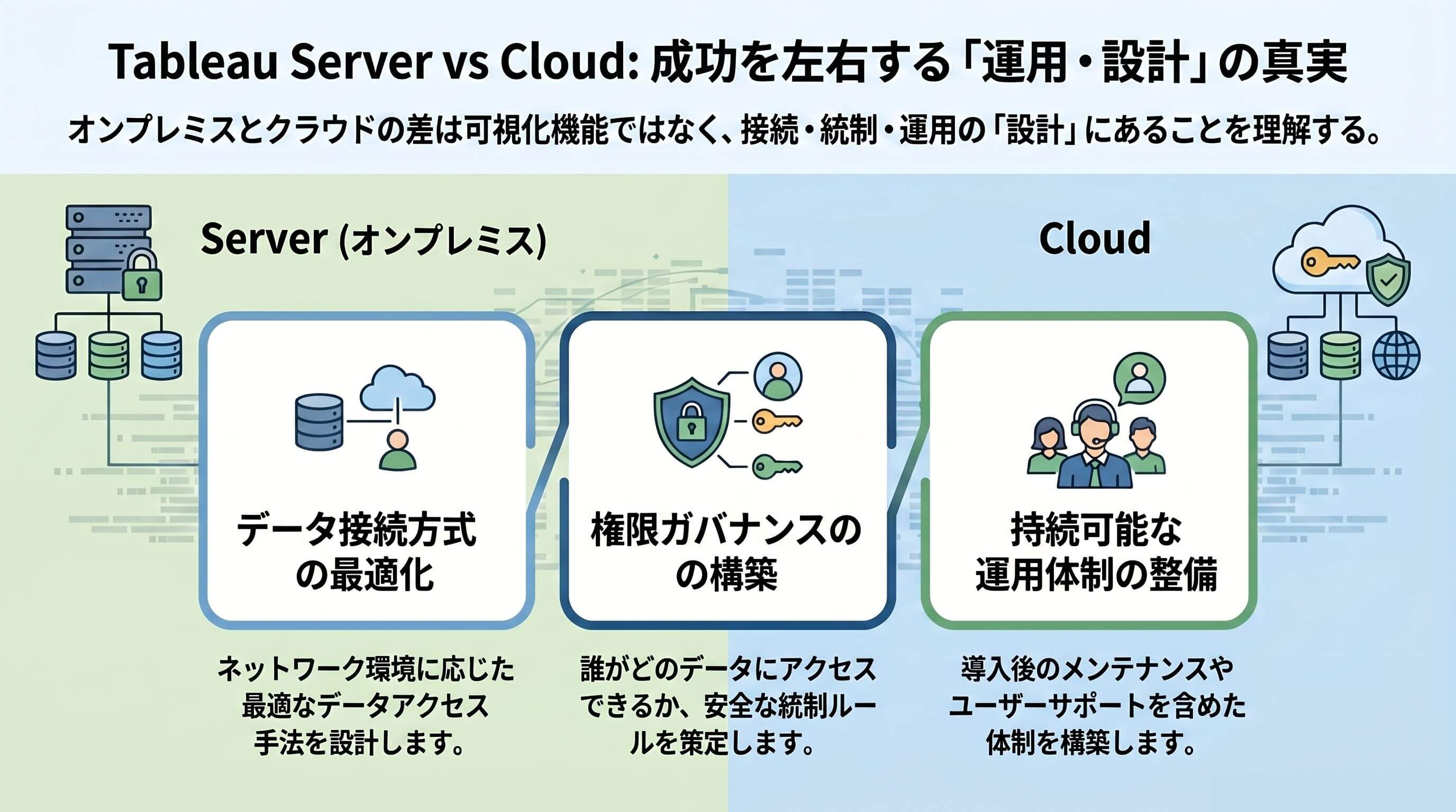 オンプレ(Tableau Server)とクラウド(Tableau Cloud)の違いは、可視化機能そのものよりも 「運用・統制・接続設計」に出ます。