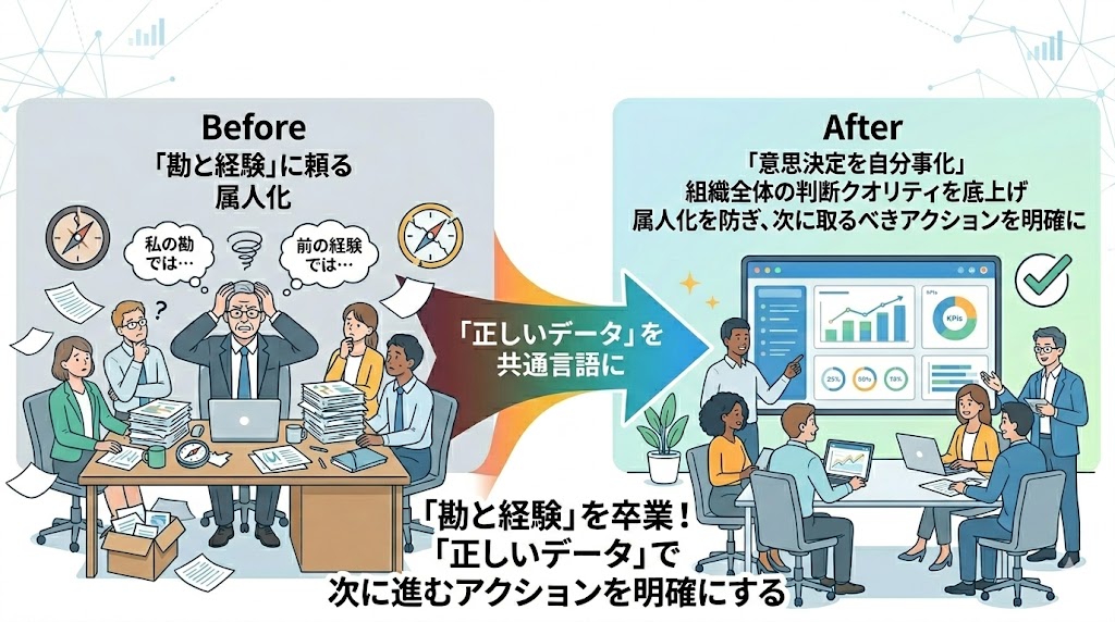 多くの現場では、日々の業務に追われる中で「勘と経験」に頼った従来の手法に固執し、データ分析から遠ざかってしまうケースが散見されます。しかし、整備された正しいデータを共通言語として全員で向き合うことで、属人化を防ぎ、次に取るべきアクションを明確にできるようになります。