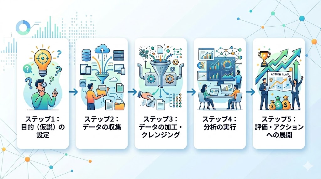 データ分析を形骸化させず、実務に活かすためには、以下のステップを丁寧に進めることが不可欠です。