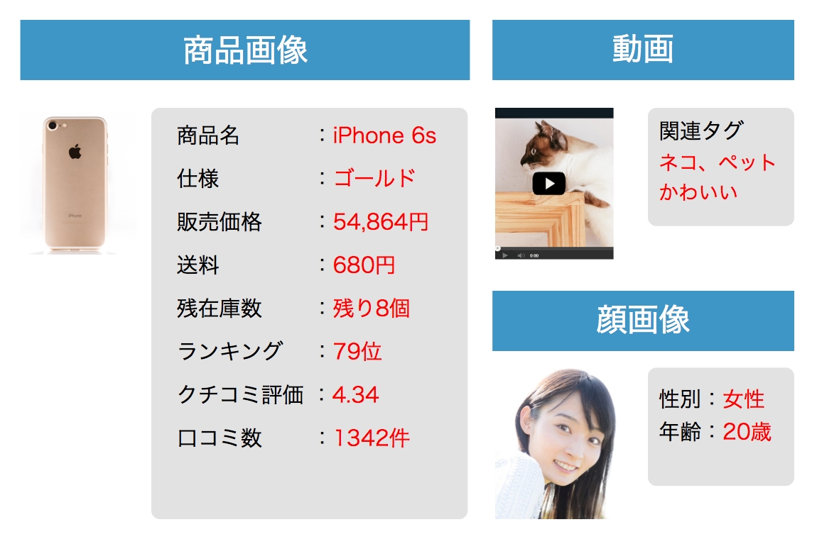 ディープラーニング等でニーズの⾼い画像データ、⾳声データ、動画データ等に分類情報をタグ付けして提供できるので、画像認識、⾳声認識、動画認識などのディープラーニング等で即活⽤ができる。(例:商品画像に次の様なTAG付がおこなえる[商品名 + 仕様 + 販売価格 + 送料 + 残在庫数 + ランキング + クチコミ評点 + クチコミ数])